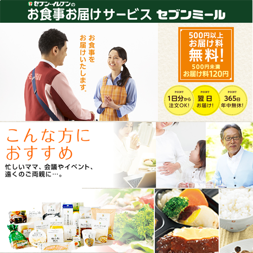 7-ELEVEn的「7meal」餐點,也打出購買商品超過500日幣就免費外送的服務,主攻宅在家的中高齡層消費需求服務。「7meal」包含各種便當、魚肉蔬果生鮮品、食材組合包、麵包、牛乳飲料等,訂購方法包括了網購、手機畫面訂購、臨店領取等。
